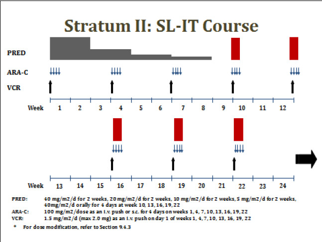 Ved hver cytarabin/vinkristin-puls fra og med uke 10 frem til uke 24 gis også prednisolon dag 1-4, full dose uten nedtrapping (amendment 2017).